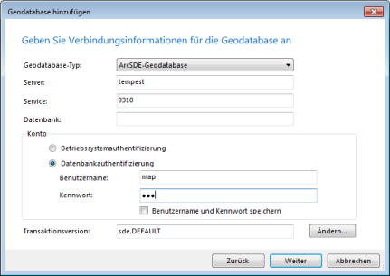 - Wenn Sie eine direkte Verbindung zu einer ArcSDE-Geodatabase herstellen, gilt Folgendes: