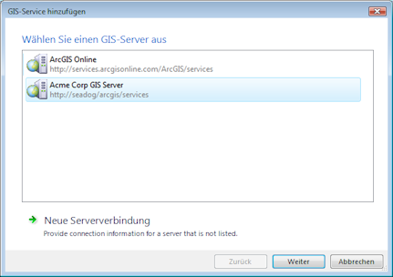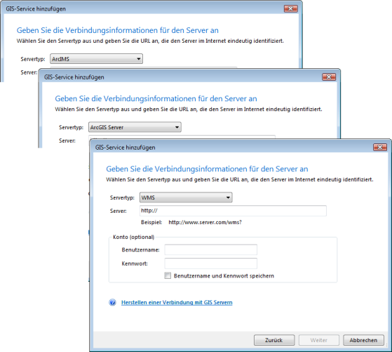 Wenn Sie eine Verbindung mit einem ArcGIS-, ArcIMS-, WMS- oder GeoRSS-Server herstellen, können Sie die auf dem Server verfügbaren Services durchsuchen. Diese Server ermöglichen es Ihnen, Ihren Karten über das Internet Daten hinzuzufügen. Wenn Sie beispielsweise ArcGIS Explorer einen ArcIMS-Service als Layer hinzufügen, werden die Daten jedes Mal, wenn der Layer gezeichnet wird, automatisch über das Internet abgerufen. Somit müssen Sie die Daten nicht mehr manuell speichern und verwalten. Über das daraufhin angezeigte Dialogfeld können Sie eine Verbindung mit der Datenquelle herstellen oder darauf zugreifen. Die URL der Datenquelle muss jedoch bekannt sein. Der Datenanbieter, Ihr Systemadministrator oder die verantwortliche Organisation haben Ihnen möglicherweise die URL zur Verfügung gestellt.