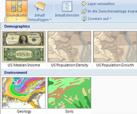 ArcGIS Explorer-Karten enthalten stets eine Grundkarte (z. B. Bild- oder Straßenkartendaten), in der andere Inhalte angezeigt werden. Auf der Multifunktionsleiste auf der Registerkarte Start können Sie über die Galerie Grundkarte dynamisch andere Grundkarten auswählen. ArcGIS Explorer enthält standardmäßig eine Reihe von Grundkarten von Esri (u. a. Satellitenbilder, Straßenkarten, topographische Karten usw.). Sie können auch zusätzliche Grundkarten hinzufügen, die dann in der Galerie Grundkarten angezeigt werden.