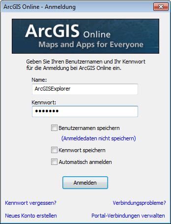 Wenn Sie über ArcGIS Explorer auf ArcGIS Online zugreifen, können Sie im Internet gespeicherte Inhalte durchsuchen und darauf zugreifen, ohne einen Webbrowser starten zu müssen. Der Zugriff auf Inhalte aus ArcGIS Online… zielt vorrangig darauf ab, Inhalte von www.arcgis.com zu suchen und herunterzuladen, die in ArcGIS Explorer verwendet werden können. Sie können auch innerhalb einer bestimmten Organisation oder im ArcGIS Online-Portal nach Inhalten suchen.