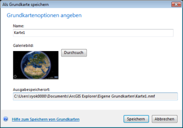 Der Name wird beim Hinzufügen der Grundkarte zu einer Anwendungskonfiguration in der Galerie zusammen mit einem Bild angezeigt. Beachten Sie, dass Explorer in der Standardeinstellung als Bild der Grundkarte für die Galerie eine Miniaturansicht der aktuellen Kartenansicht generiert. Wenn Sie selbst ein Bild für die Galerie erstellt haben, klicken Sie auf die Schaltfläche Durchsuchen..., um dieses auf dem lokalen Computer oder im lokalen Netzwerk zu suchen. Beachten Sie außerdem, dass der am unteren Rand des Dialogfelds angezeigte Ausgabe-Speicherort nicht geändert werden kann.
