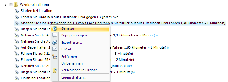 Wenn Sie einen Stopp oder eine Abzweigung entlang der Route verschieben, heranzoomen oder eine andere Aktion durchführen möchten, wählen Sie den Stopp oder die Abzweigung aus und verwenden Sie die Steuerelemente auf der Registerkarte Werkzeuge oder klicken Sie mit der rechten Maustaste in der Liste Stopps auf den Stopp oder klicken Sie mit der rechten Maustaste auf die Abzweigung in der Liste Wegbeschreibung und wählen Sie eine der Optionen im Kontextmenü aus: