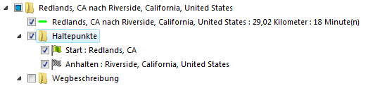 Nach erfolgreicher Ausführung von Route wird im Fenster Inhalt ein Element <Ausgangsposition> bis <Endposition> angezeigt. Erweitern Sie den Ordner, um Informationen über die Route anzuzeigen:
