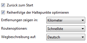 Sie können auswählen, in welchen Einheiten Entfernungen angegeben werden und in welcher Sprache die Wegbeschreibung angezeigt wird. Unabhängig davon, ob Sie die Route optimieren, ist der oberste Stopp in der Liste immer der Anfangspunkt.