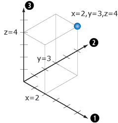 In der Abbildung unten wird mit der Notation (2, 3, 4) ein Punkt dargestellt, der um zwei Einheiten auf der X-Achse und um drei Einheiten auf der Y-Achse vom Ursprung entfernt ist und dessen Höhe vier Einheiten über der Erdoberfläche liegt (beispielsweise vier Meter über dem mittleren Meeresspiegel).
