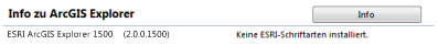 Klicken Sie auf Info, um Informationen zu dieser Version von ArcGIS Explorer zu erhalten, einschließlich Copyright-Informationen und sonstigen rechtlichen Informationen. Rechts neben der Versionsnummer wird eine Meldung angezeigt, die angibt, ob auf dem Computer Schriftarten von Esri installiert sind.