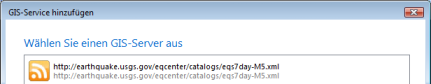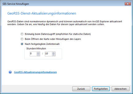 In gleicher Weise können Sie mit ArcGIS Explorer einen Online-Dienst abonnieren, der geographische Informationen beinhaltet und in einem der unterstützten GeoRSS-Formate codiert ist.