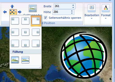 - Klicken Sie in der Gruppe Größe und Position auf der Registerkarte Werkzeuge auf Bild-Overlay ändern, und wählen Sie in der Galerie die Position, die der Position auf dem Bildschirm entspricht: