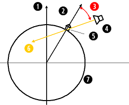 The Angle of Tilt indicated by the tilt disc shows the degree to which the Direction of View is offset from the Target Vector. When the angle is 0 and the disc appears as a circle at the center of the Navigation Control, then the Direction of View and the Target Vector are the same. The following diagram illustrates these relationships: