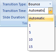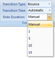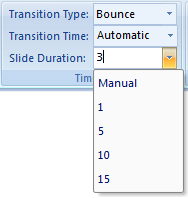 Type in or select a time value in seconds in the Slide Duration combo box.