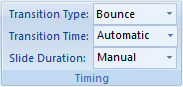 The Slide Timings group provides the option for slides to advance manually or automatically. A manual slide is one in which the user controls when the slide will be advanced. The spacebar or one of the buttons on the mini-toolbar which appears during a presentation can be used to navigate the slide deck. An automatic slide is one in which the slide advances automatically, without user interaction, based on pre-defined slide timing set in seconds. There is also control for the type and length of transtion between slides.