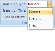 There are 3 transition types: Bounce, Straight and Snap. An icon indicating the transition type is displayed next to each slide.