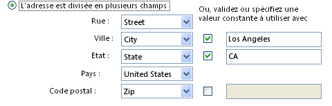 Si votre fichier ne comprend pas, par exemple, un champ Ville et un champ Etat, mais que vous savez que toutes les adresses sont dans la même ville et le même Etat, vous pouvez cocher les cases appropriées et saisir une valeur constante, par exemple :