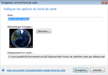 Le nom apparaît dans la bibliothèque avec une image, lorsque vous ajoutez le fond de carte à une configuration d'application. Remarquez que par défaut, Explorer génère une image miniature de la carte en cours d'affichage comme image de la bibliothèque de fonds de carte. Si vous avez créé une image pour la bibliothèque par vous-même, cliquez sur le bouton Rechercher... pour la localiser sur votre machine ou votre réseau local. Remarquez également que l'emplacement en sortie figurant au bas de la boîte de dialogue ne peut pas être modifié.