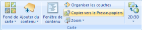 Vous pouvez incorporer la vue affichée actuellement dans d'autres applications en capturant une image de la carte. Pour ce faire, établissez la vue comme vous le souhaitez, puis à partir de l'onglet Accueil dans le groupe Carte, cliquez sur Copier dans le Presse-papiers :