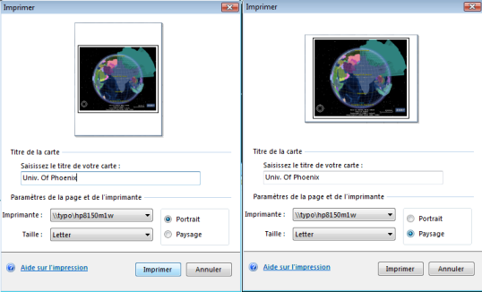 Vous pouvez imprimer directement votre carte à partir d'ArcGIS Explorer. Vous pouvez imprimer l'étendue actuellement visible, la flèche du Nord, toutes les informations de copyright et d'attribution ainsi qu'un titre. ArcGIS Explorer fournit la police du texte et la mise en page de la carte imprimée. Toutefois, vous pouvez désigner l'imprimante vers laquelle vous souhaitez imprimer, la taille du papier et le mode d'impression, paysage ou portrait. Le graphique affiché dans la boîte de dialogue permet d'illustrer l'orientation de la carte.