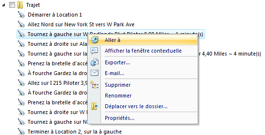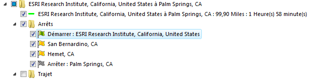Une fois que la fonction Itinéraire s'est terminée avec succès, vous allez voir un élément dans la fenêtre Contenu indiquant <lieu de départ> à <lieu d'arrivée>. Développez le dossier pour afficher les informations relatives à l'itinéraire :
