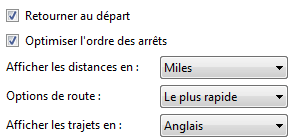 Vous pouvez préciser en quelles unités vous souhaitez exprimer les distances à parcourir et dans quelle langue vous souhaitez que les indications soient données. Le premier arrêt de la liste est toujours le point de départ.