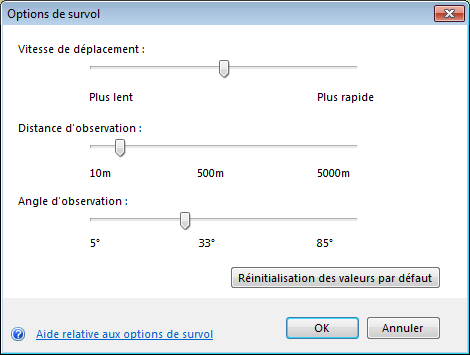 Dans la boîte Options de survol, déplacez la case de défilement du contrôle de l'Angle du point d'observation vers la droite pour augmenter l'altitude. Cette option n'est pas disponible dans la vue 2D.