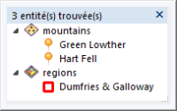 Vous pouvez identifier les éléments que vous avez ajoutés à votre carte. Pour ce faire, placez la souris sur une entité et cliquez dessus. Si une seule entité est identifiée, une fenêtre contextuelle affichant le contenu ou les attributs disponibles pour cette entité s'ouvre. Si plusieurs entités sont identifiées, ou si des entités présentes dans plusieurs couches sont renvoyées, la fenêtre des résultats pertinents s'affiche. Vous pouvez alors sélectionner une entité dans la liste pour afficher les attributs. Par la suite, si vous souhaitez rouvrir la fenêtre des résultats pertinents, cliquez sur l'icône