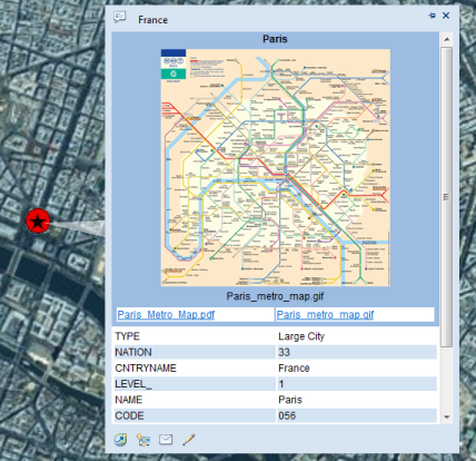 Cliquez sur l'entité pour ouvrir la fenêtre contextuelle de l'entité. Les pièces jointes apparaissent sous la forme d'hyperliens en haut de la fenêtre contextuelle. En présence d'images en pièce jointe, une image apparaît dans la fenêtre contextuelle.
