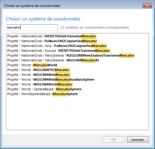 Vous pouvez saisir le nom ou le nom partiel d'un système de coordonnées dans la zone Rechercher. La boîte de dialogue n'affiche alors que les systèmes de coordonnées correspondant à la chaîne de recherche.