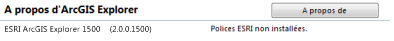 Pour en savoir plus sur cette version d'ArcGIS Explorer, y compris les informations de copyright et les autres informations légales, cliquez sur A propos. A droite du numéro de version, un message indique si les polices Esri sont installées sur votre machine.