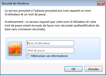Indiquez le nom d'utilisateur et le mot de passe fournis par votre administrateur système. Pour les connexions suivantes, ArcGIS Explorer ne vous demandera pas ces informations. Si vous devez modifier vos paramètres, vous pouvez le faire dans la page Avancé de la boîte de dialogue Options d'ArcGIS Explorer. Vous pourrez accéder à une section intitulée Authentification du serveur proxy. Remarquez toutefois que votre navigateur demande un nom d'utilisateur et un mot de passe si vous appelez le navigateur dans le cadre d'une application sur votre système. La boîte de dialogue suivante peut ainsi s'afficher :