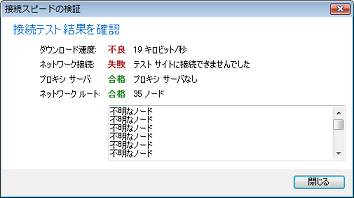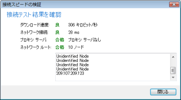 ArcGIS Explorer が動作するコンピューティング環境を最大限に効率化するため、ArcGIS Explorer に備わっている簡単なテストを実行することで、ダウンロード速度(データ伝送媒体上の帯域幅の大きさ(一定時間内に流れるデータの量)(単位: キロビット))、ネットワーク接続の待ち時間比率、プロキシ サーバが適切に稼働しているかどうかについての情報、ネットワークのルート、テスト サイトに到達するまでに経由したノードの数を調べることができます。使用するコンピュータや時間帯などの環境要因によって結果は異なります。
