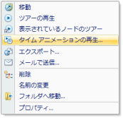 [タイム アニメーションの再生] ウィンドウが表示されていない場合、または別のレイヤの時間帯に設定されている場合は、[コンテンツ] ウィンドウで再生するアイテムを選択し、[ツール] タブの [アイテム] グループで [タイム アニメーションの再生] ボタンをクリックするか、またはレイヤのコンテキスト メニューで [タイム アニメーションの再生...] をクリックします。