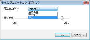 ([オプション]ボタン)があります。[オプション] ボタンをクリックすると、[タイム アニメーション オプション] ダイアログが表示され、アニメーションの再生が 1 回終了した後の動作や、アニメーションの再生スピードを設定することができます。