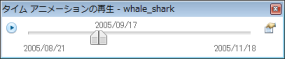 | KML ファイルの時系列データのアニメーションを再生するには、[再生] ボタンをクリックします([タイム アニメーションの再生] ウィンドウの左上隅の矢印ボタン)。 |