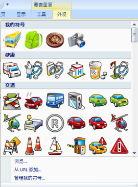 Esri 在 ArcGIS Explorer 符号图库 中提供了一些点符号;但是,您可能找不到所需要的符号。这种情况下,可以选择将其他点符号加入到地图中,并将它们存储在符号图库 中以供重复使用。符号的图像格式必须为下列之一:.bmp、.ico、.png、.jpg 或 .jpeg、.gif、.exif、.tif 或 .tiff。请注意,可对上述的一些格式中进行透明度设置以满足您的需要。