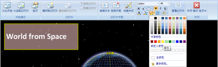 在演示 选项卡的标题格式 组中单击轮廓颜色 按钮可选择幻灯片标题轮廓的颜色。下图中,轮廓被设置为“黄色”: