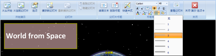 除了颜色之外,还可以设置轮廓的宽度。在演示 选项卡的标题格式 组中单击轮廓宽度 按钮可选择轮廓的宽度: