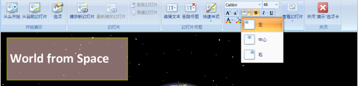 在演示 选项卡的标题格式 组中,单击标题位置 按钮从用于定位幻灯片标题的三个位置中选择一个。下图中,幻灯片标题位于左侧: