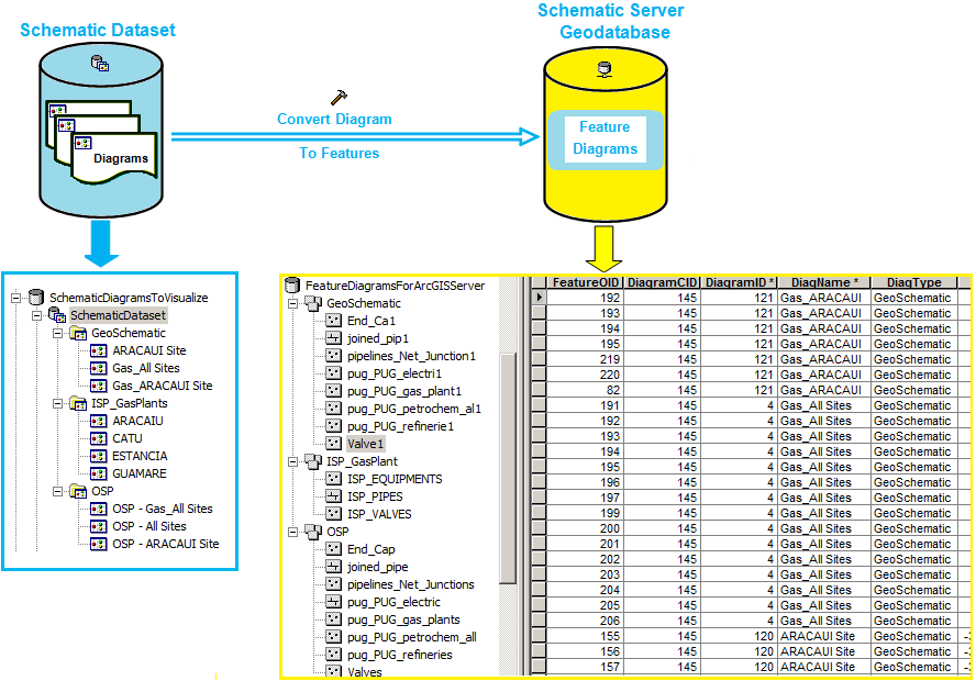 Schematics 9.3 provides a specific geoprocessing tool that allows schematic diagrams to be converted into Feature Diagrams to be consumed by ArcGIS Server. A Feature Diagram is a collection of features converted from the schematic elements contained in a given schematic diagram using the Convert Diagram To Features geoprocessing tool. Feature diagrams are stored in a Schematics Server Geodatabase. The Schematics Server Geodatabase's structure is organized around several feature datasets; each of them containing schematic features related to different diagrams implemented by a same diagram type (see Figure 1).