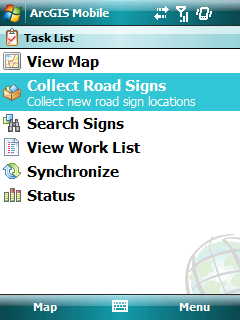 After receiving data from the server using the Synchronize task, you are ready to collect new road sign locations using the Collect Features task. GIS feature collection using the ArcGIS Mobile application is accomplished using the Collect Features task and you will collect new signs within the Road Signs layer. The task itself will drive you through the collection process by first requiring you to choose a type of feature to collect, then prompting you to sketch or capture the location of the new feature and finally to assign attribute information to it. During the process of defining the mobile project, you should have renamed the Collect Features task to Collect Road Signs. When authoring the map, you set a unique value renderer for the Road Signs layer. Each value in the renderer is a feature type in the Collect Features task.