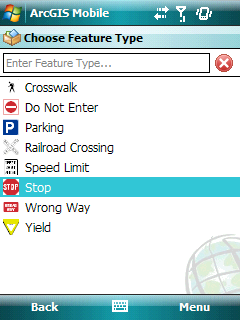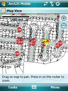 Once you have chosen a feature type, the map page will appear so that you can locate the shape of the new stop sign. By default, the map page is in a mode where you can simply tap on the map with your stylus to create the location of the Stop sign. However, the map may not be centered at the proper location or it may be zoomed in too close or out too far. If you are at the right scale, you can simply use the directional pad on the rocker to move the cursor. When the cursor reaches the edge of the map display, it will automatically pan in that direction. Also, you can zoom in or zoom out on the map by pressing the right soft key menu and pressing Zoom In command or the Zoom Out command.