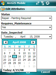The final step of the collection process is to set attributes for the new feature. Fields that contain business rules (domains) present a drop-down list of valid values for you to choose from. Date fields provide a date picker to choose the correct date from.