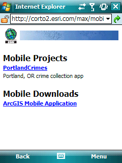 To install the application, open Internet Explorer on your Windows Mobile device and navigate to http://<web_server>/arcgis/mobile.