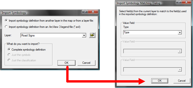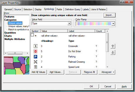 The Road Signs layer uses a unique value renderer to identify each of the feature types that can be collected in the ArcGIS Mobile application. The legend item for each value in the renderer is the name assigned to the feature type. Once you have successfully changed the symbology for the Road Signs layer, alter the symbology for the remaining layers following the above steps.