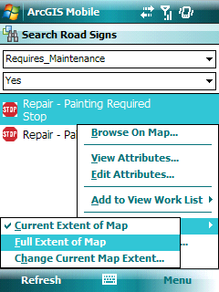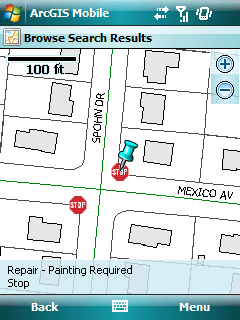 You can browse each feature by pressing the up or down arrow on the directional pad of the rocker. The information bar displays the feature type and the value of the primary display field of the feature. As you move between features, the map will pan to include the browsed feature on the display. Point features (like road signs) will be highlighted using a pin.