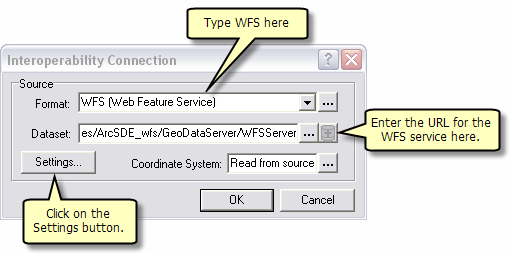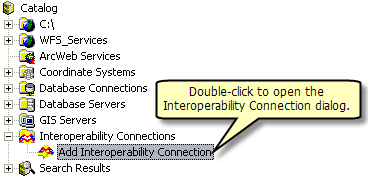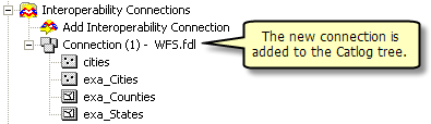 The Data Interoperoperability Extension allows you to read and write data in non-ArcGIS data formats. You can use the Interoperability Connection tool located in ArcCatalog to connect directly to external ESRI data formats, including WFS services. Once the connection is made, the data source will appear underneath the Interoperability Connection entry in the Catalog Tree. A connection is just like any other dataset in that you can add it to ArcMap or use it in geoprocessing tools.