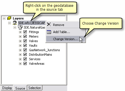 Right click on the geodatabase and select Change Version. This opens the Version Manager dialog.