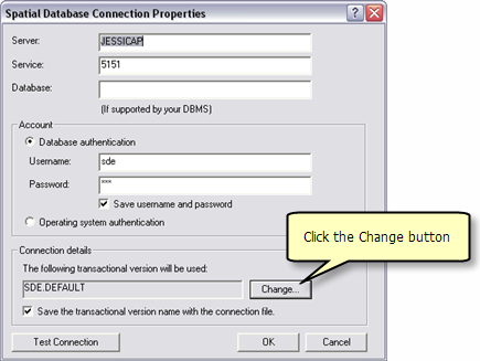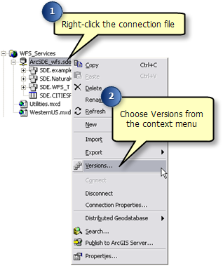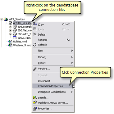 To ensure that the geodata service publishes the appropriate data when it is created, the connection properties of the Geodatabase must be updated so that they reference the new WFS version that has been created.