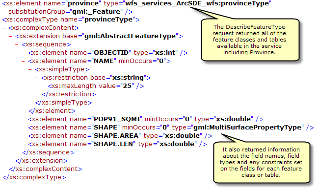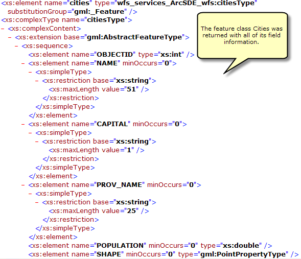In the example below the DescribeFeatureType request is used to identify the field information for the feature type called cities.