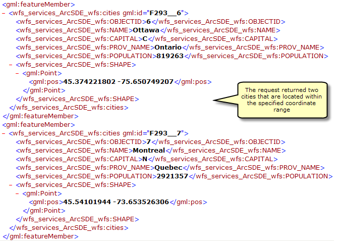 You can also add filters in the request to refine the results that are returned. For example you can request all of the cities that are within a specified coordinate range. In the example below two cities are located within a specified coordinate range.