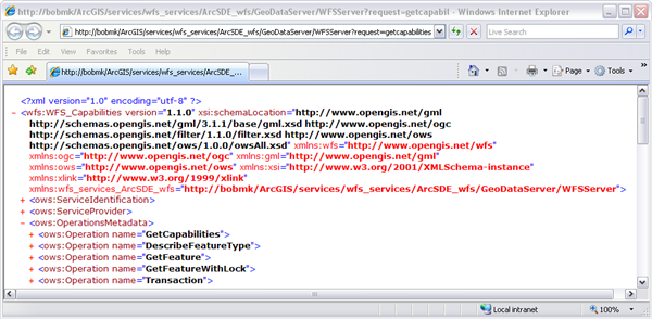 URL Example: http://bobmk/arcgis/services/wfs_services/ArcSDE_wfs/GeoDataServer/WFSServer?SERVICE=WFS&VERSION=1.1.0&REQUEST=DescribeFeatureType&VERSION=1.1.0