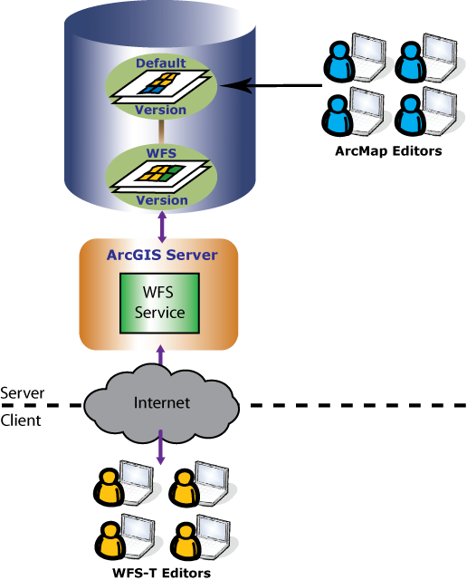 In this example, WFS-T editors and ArcMap editors use versions so that each group can have their own isolated view of the geodatabase to work with. ArcMap editors are directly editing the Default version through ArcMap. WFS-T editors are accessing the WFS service over the internet. This allows WFS-T editors to make edits on the WFS version that was created as a child of Default. To learn more about versions, see Understanding versioning in the desktop help system.
